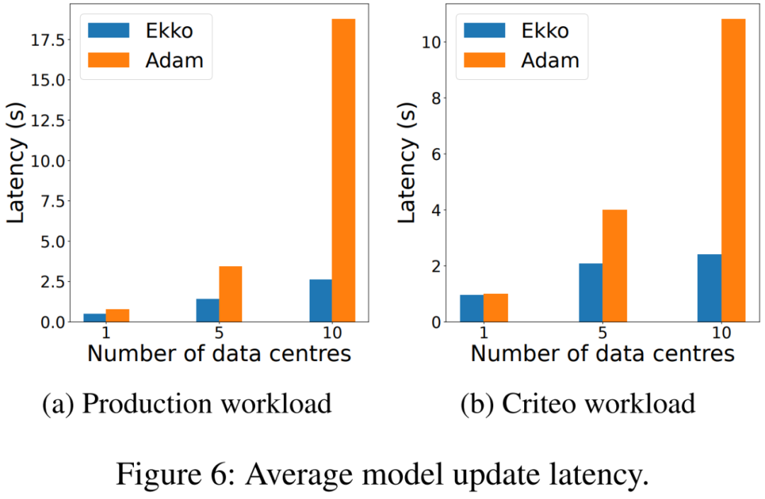 先来看同构 WAN,研究者对 Ekko 与 Adam 进行比较。具体地,研究者分别用 1 个 DC(3 副本)、5 个 DC(15 个副本)和 10 个 DC(30 个副本)来测量延迟。结果如下图 6a 和 6b 所示,在生产和 Criteo 工作负载中,Ekko 的延迟明显低于 Adam。并且,当使用运行生产工作负载的 10 个 DC 时,Ekko 实现了 2.6 秒的延迟,这要比 Adam 的 18.8 秒低了 7 倍。