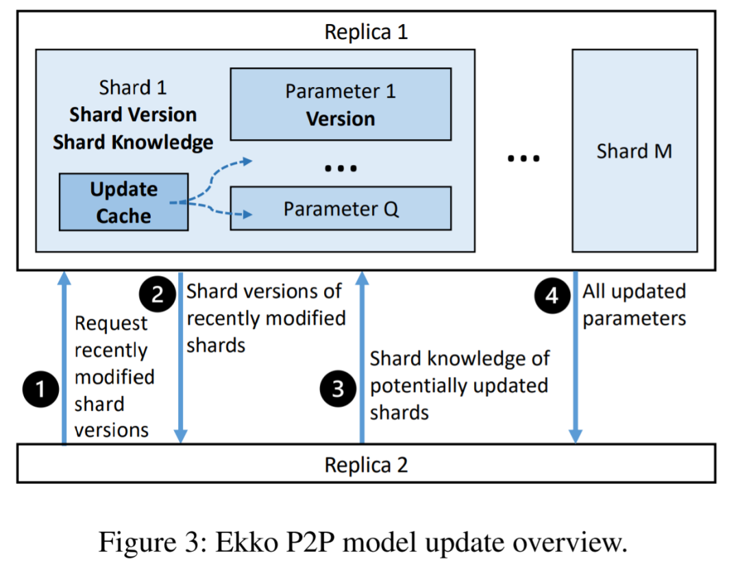为了完成模型更新,副本 2 向副本 1 ( 1 ) 请求最近修改的分片版本。收到请求后,副本 1 返回最近修改的分片版本列表 (2)。副本 2 然后将副本 1 的所有分片版本与本地分片版本进行比较,然后将相关的分片知识发送到副本 1 ( 3 )。最后,副本 1 将所有更新的参数发送到副本 2 ( 4 )。按照这些步骤,Ekko 可以确保模型更新最终以低延迟(即最终一致性)传播到所有副本。