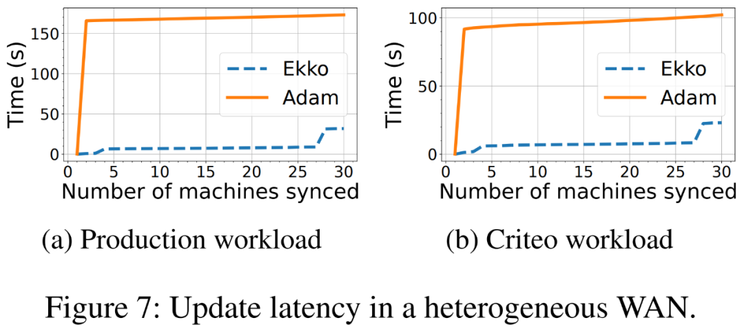 研究者分别在同构 WAN 和异构 WAN 中评估了 Ekko 的更新延迟,其中使用了两个基线——Adam 和 Checkpoint-Broadcast,后者是在 DLRS 终应用模型更新的实际方法。Ekko 和基线都使用 DRAM 存储,并采用相同的主要分配和负载平衡方案。