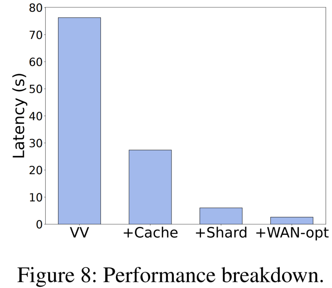 结果如下图 8 所示,仅使用 VV,Ekko 需要 76.3 秒来同步所有参数。而当启用更新缓存后,Ekko 将延迟降低到了 27.4 秒,实现了 2.8 倍加速。