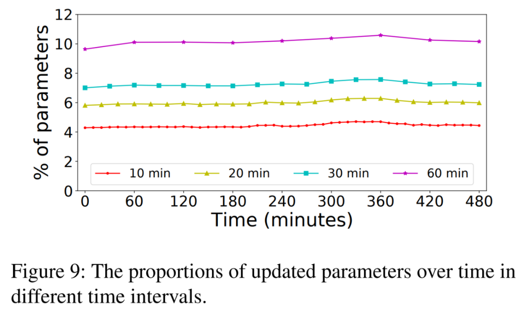 研究者选择更新密集型 DLRS 模型来揭示最坏情况下更新局部性的影响。下图 9 显示了在 480 分钟窗口中更新参数的比例。这个时间窗口涵盖了生产 DLRS 一天中最繁忙的时间。