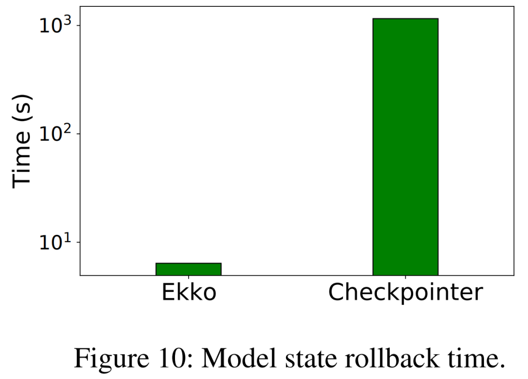 关于在线模型状态回滚,研究者将 Ekko 与检查点恢复(checkpoint-recovery)方法进行比较。