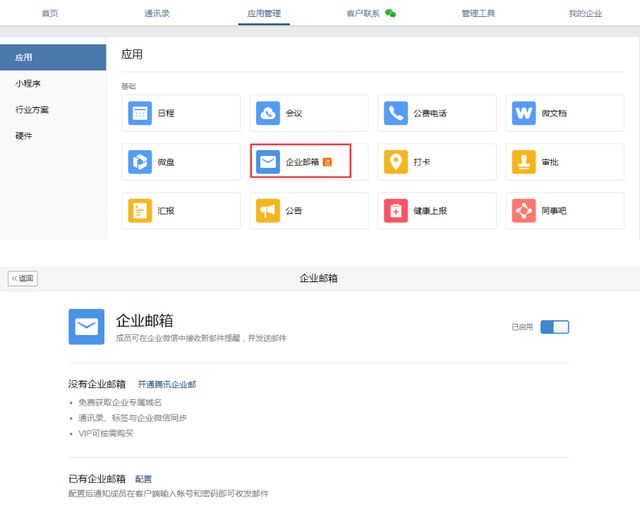企业微信官网登录管理后台-应用管理-企业邮箱。