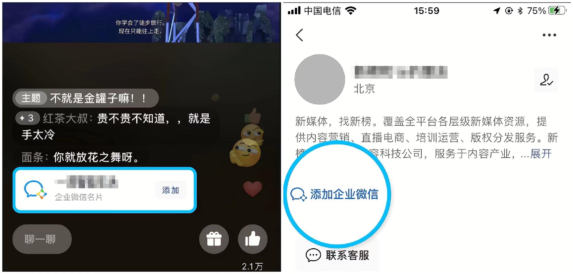 这也就意味着:看视频/直播——感兴趣——加企业微信——进一步咨询变成了一条笔直的公路,这样一来就对需要做服务和销售转化的公司十分友好。