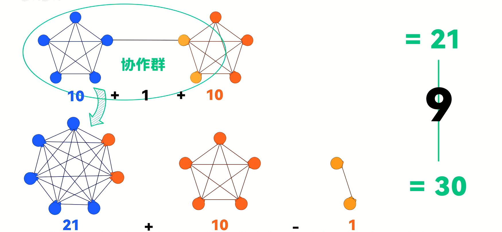 这时任意一家公司的群中拉进来对方公司的工作人员连接点数就变成了10+1+10=21,如果在这个21个连接点的项目群中再次拉入一家下游的供应链企业,那么整个项目的联动效果就会变成:21+10-1=30的效果,直接增加了9个点的高效连接。