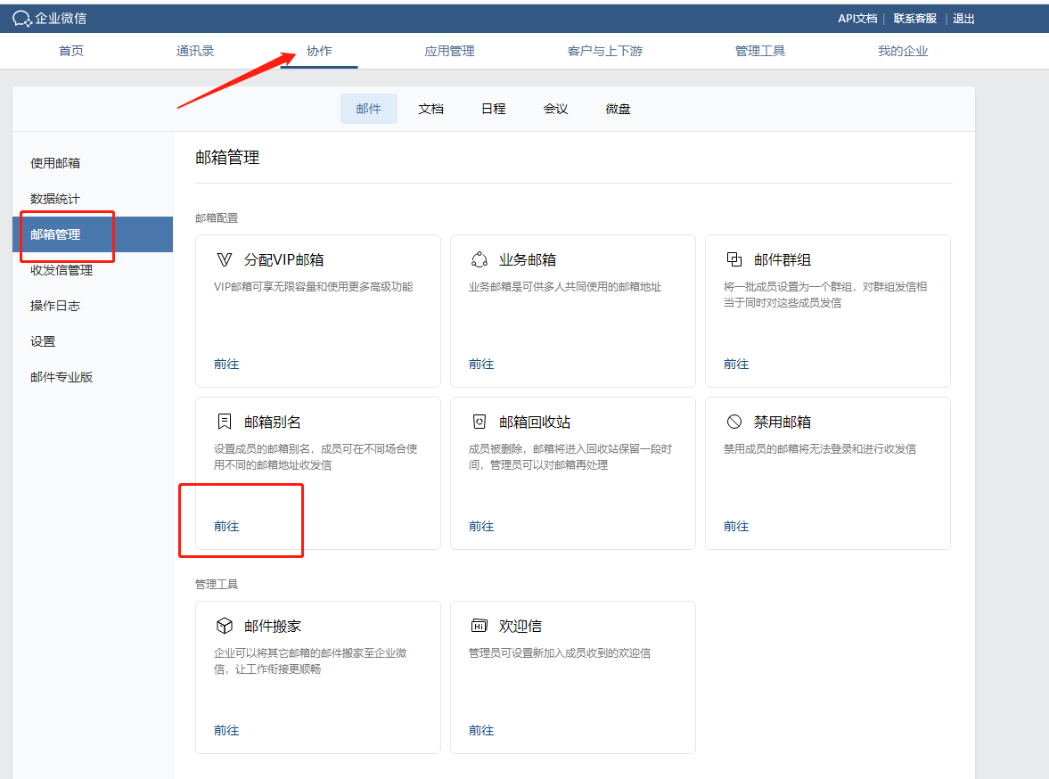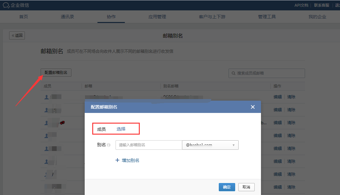 在企业微信后台—-协作—-邮箱管理—-邮箱别名中选择配置邮箱别名即可。
