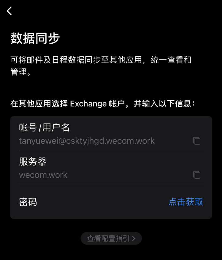 腾讯企业邮支持在win系统outlook客户端使用Exchange ActiveSync兼容服务访问邮件、日历、联系人等。可以在企业微信客户端登录邮箱关联的企业微信账号“设置-帐号”中获取授权密码,服务器需填写:wecom.work注意:其中密码只显示一次,需在每次使用时单独获取,以保护数据安全。