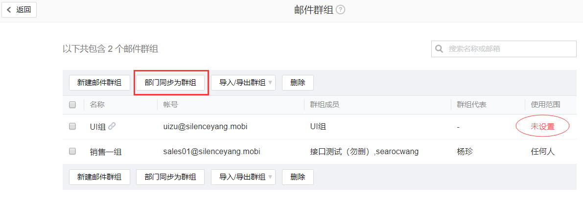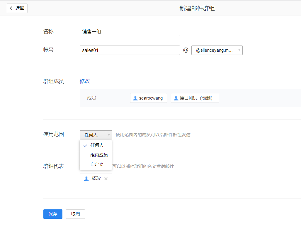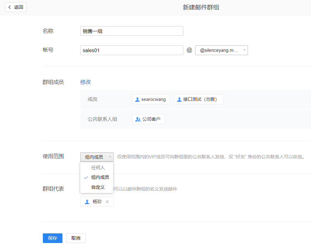 例如:将企业中的销售员工设置为一个邮件群组sales@abc.com,后续只需要给这个地址发信,企业中的销售人员就都能同时收到了。如设置某位销售为群组代表,那么该销售人员可以代表群组发送邮件。