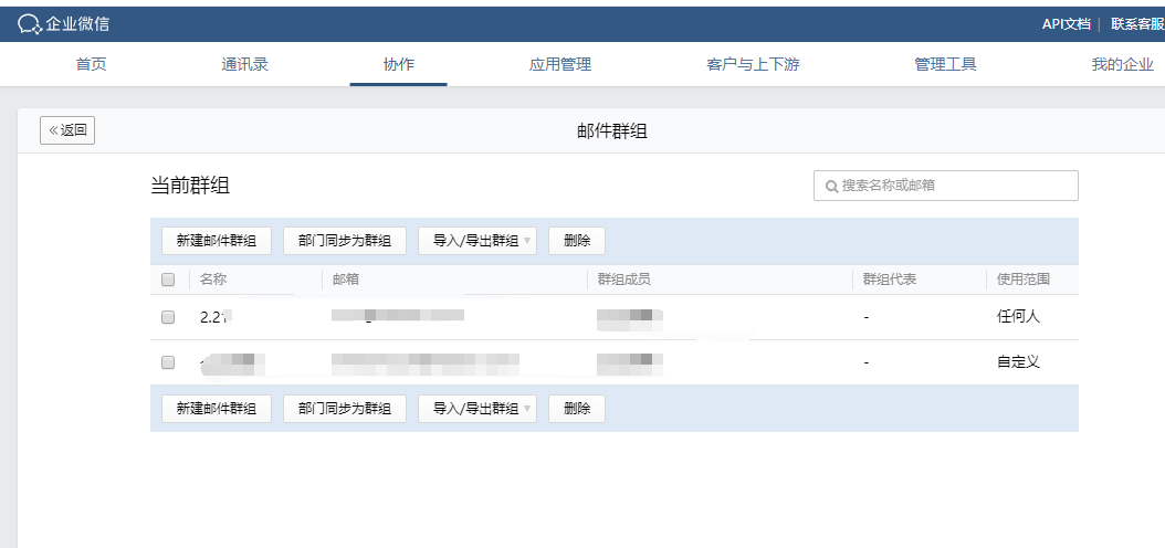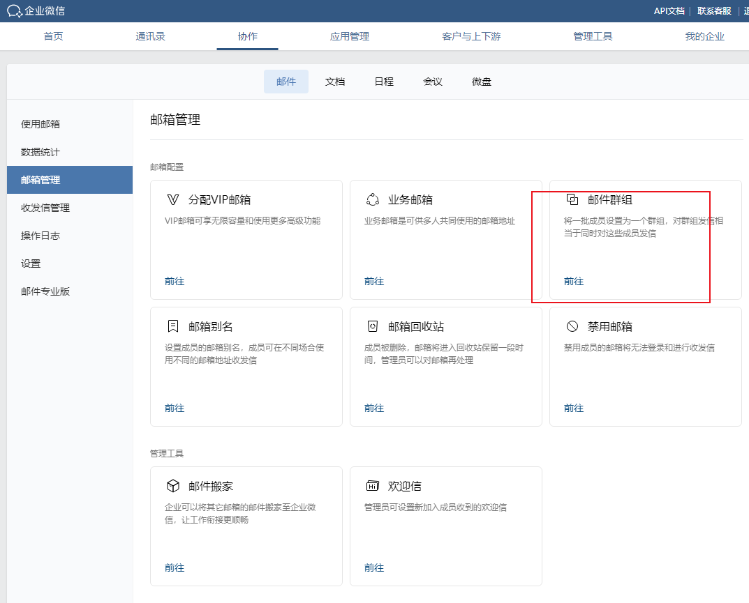 新建群组入口:登录企业微信管理端—协作—邮箱管理—邮件群组