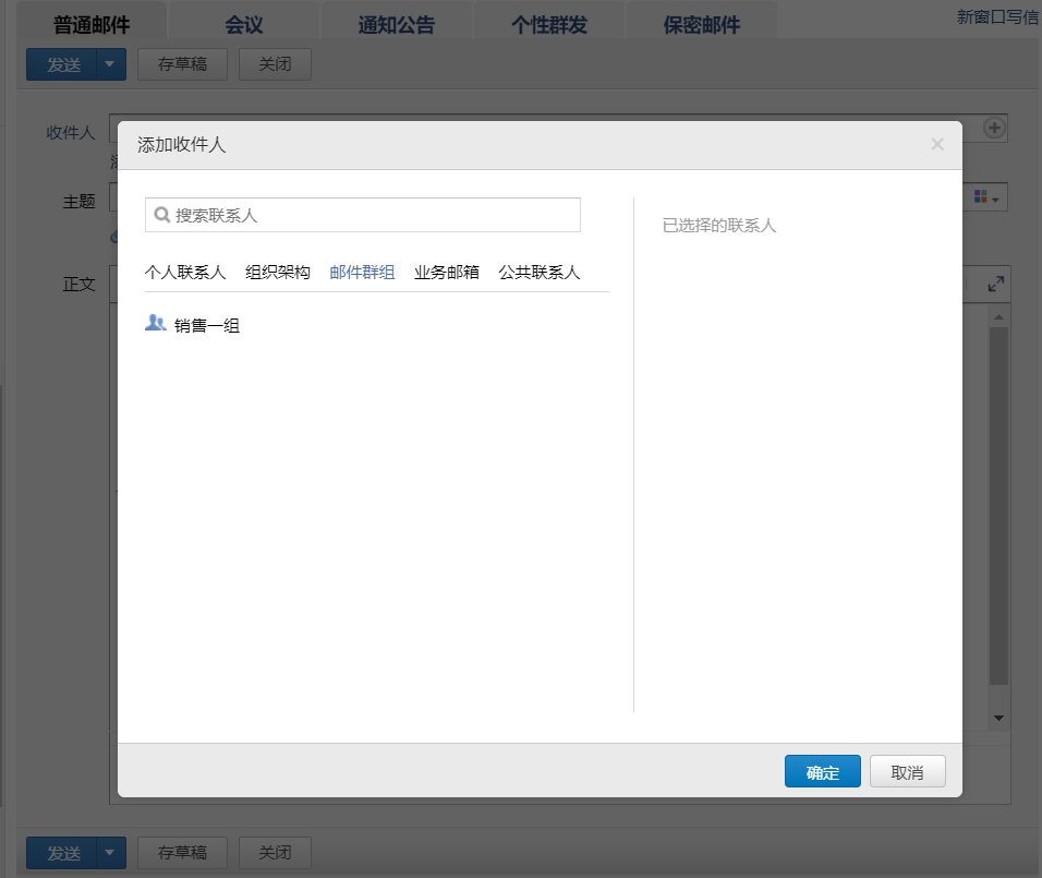 情况一:当群组成员仅有企业内成员时,管理员共享企业地址本后,写信时在联系人中选择相应群组即可: