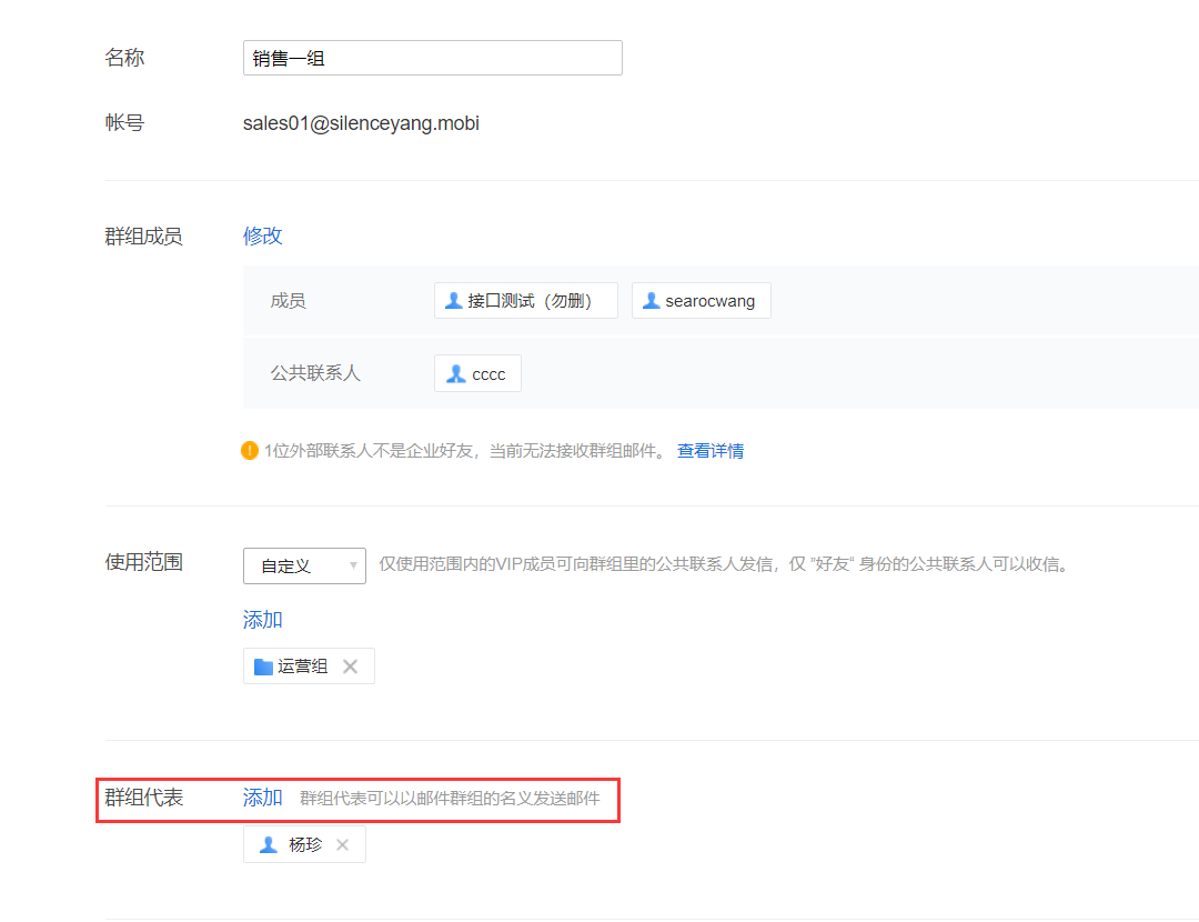 邮件群组支持设置群组代表,代表群组发送邮件。