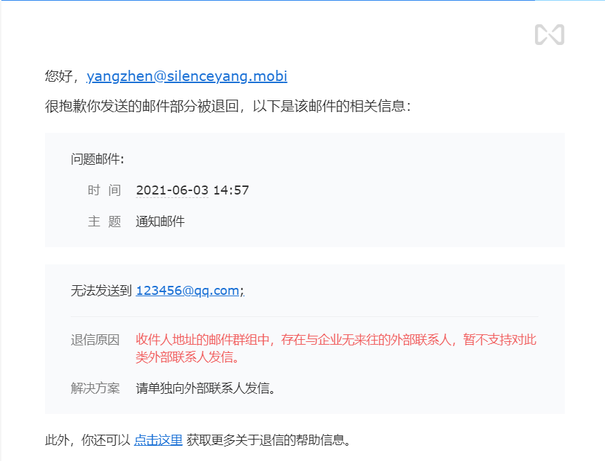 情况二:当群组成员包括公共联系人时,管理员共享企业地址本后,仅vip成员可以给群组中好友关系公共联系人发信,如包括陌生人会收到退信。