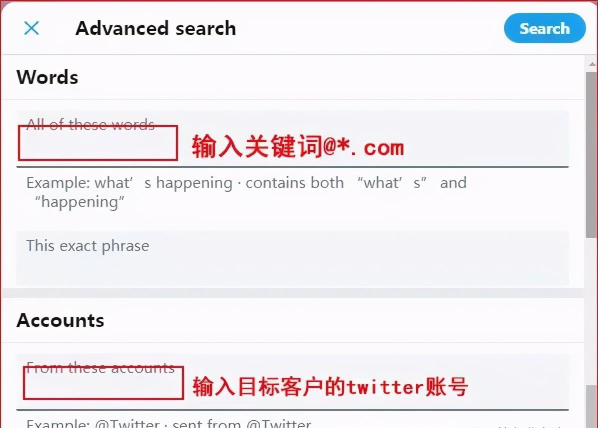 首先打开Twitter的高级搜索设置面板;设置地址: