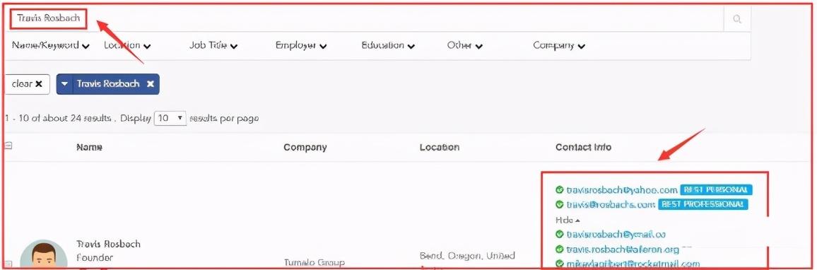 在搜索框中输入目标联系人姓名“Travis Rosbach”之后,Rocket Reach会经过一段时间的搜索,然后给出该姓名下的所有潜在联系人员名单,一共搜索出了24个潜在结果。