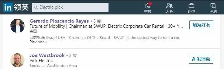 如上图所示,我们点击添加到chrome浏览器,然后到之前的官网页面注册一个新账号。安装完成之后我们打开LinkedIn,去寻找相应的目标客户群体。我们以关键词“Electric pick电镐”为例,来进行实操讲解