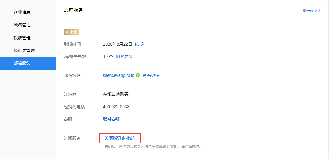 如有添加企业域名,需先注销企业域名后(注销域名所有数据会同步删除,请谨慎操作)再关闭企业邮箱。