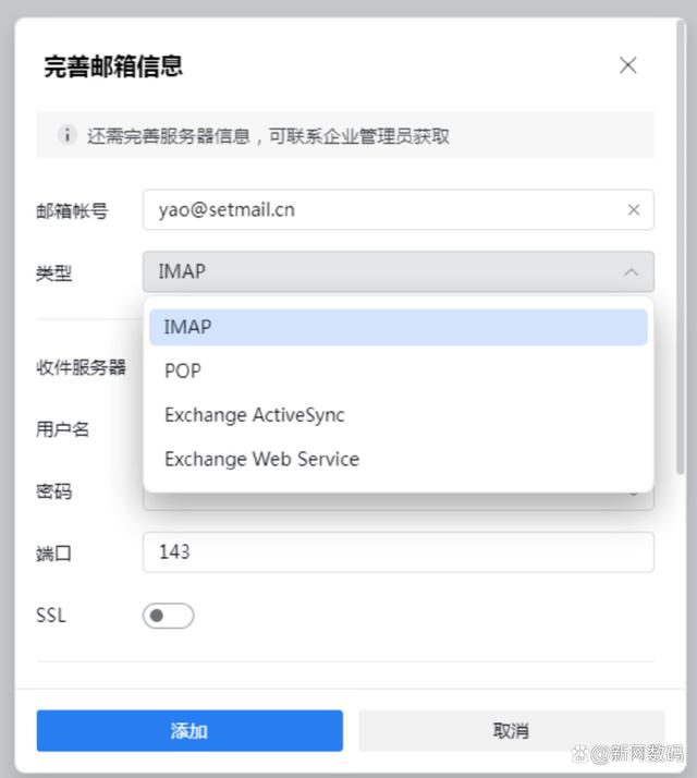 二、同意“添加工作邮箱授权协议”,进入完善邮箱信息界面,可选不同类型服务,建议选IMAP,下图标红都为企业邮箱域名;
