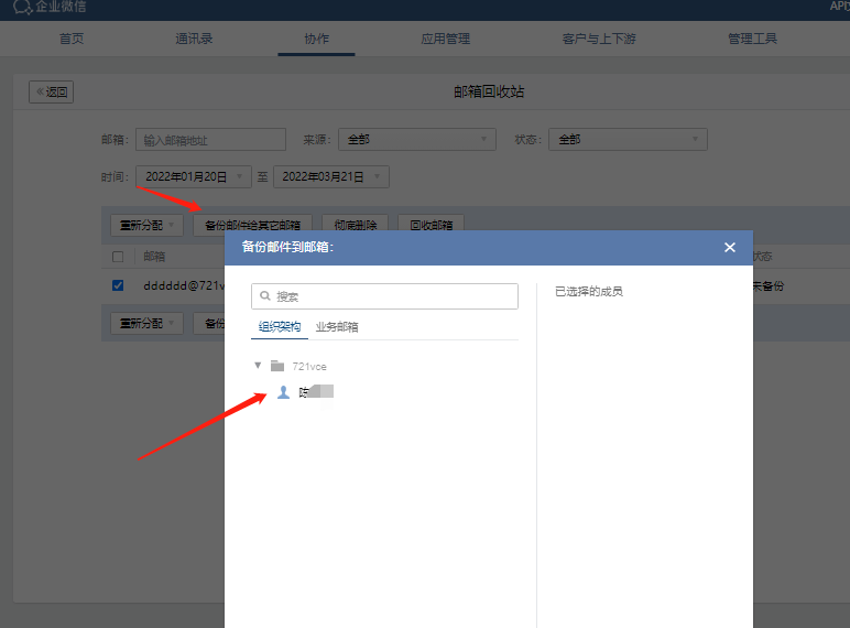 8、回收邮箱:若是需要更换邮箱绑定的企业微信账号,可以通过回收邮箱功能,将成员邮箱回收进回收站,再次重新分配给其他企业微信账号绑定使用。
