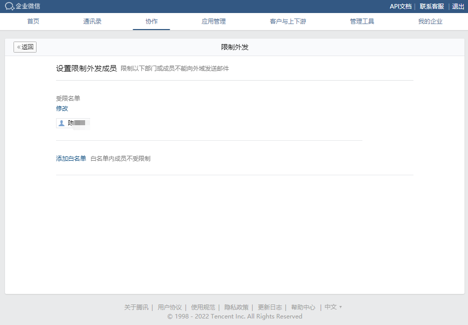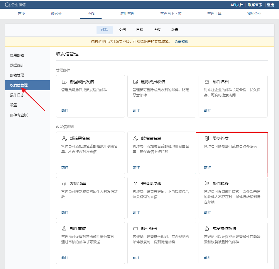 1.在企业微信管理员后台找到协作—【收发信管理】—【限制外发】功能入口: