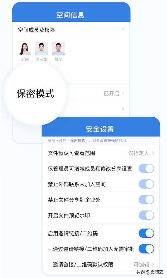 微盘提供‘文件保密’模式,开启后这个空间的文件只有空间成员可以看见。不必担心企业重要信息被无关人员看到。