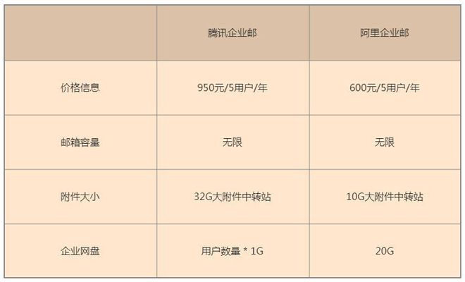 在收费上,各家均以套餐收费为主。腾讯企业邮箱,5个用户起购,950元/5用户/年;阿里企业邮,5用户起购,600元/5用户/年;比较而言,阿里企业邮箱价格便宜,而腾讯企业邮则提供32G的存储容量(不占用邮箱容量),邮件可以发送更大的“超大附件”,解决传统邮件附件大小受限的问题。
