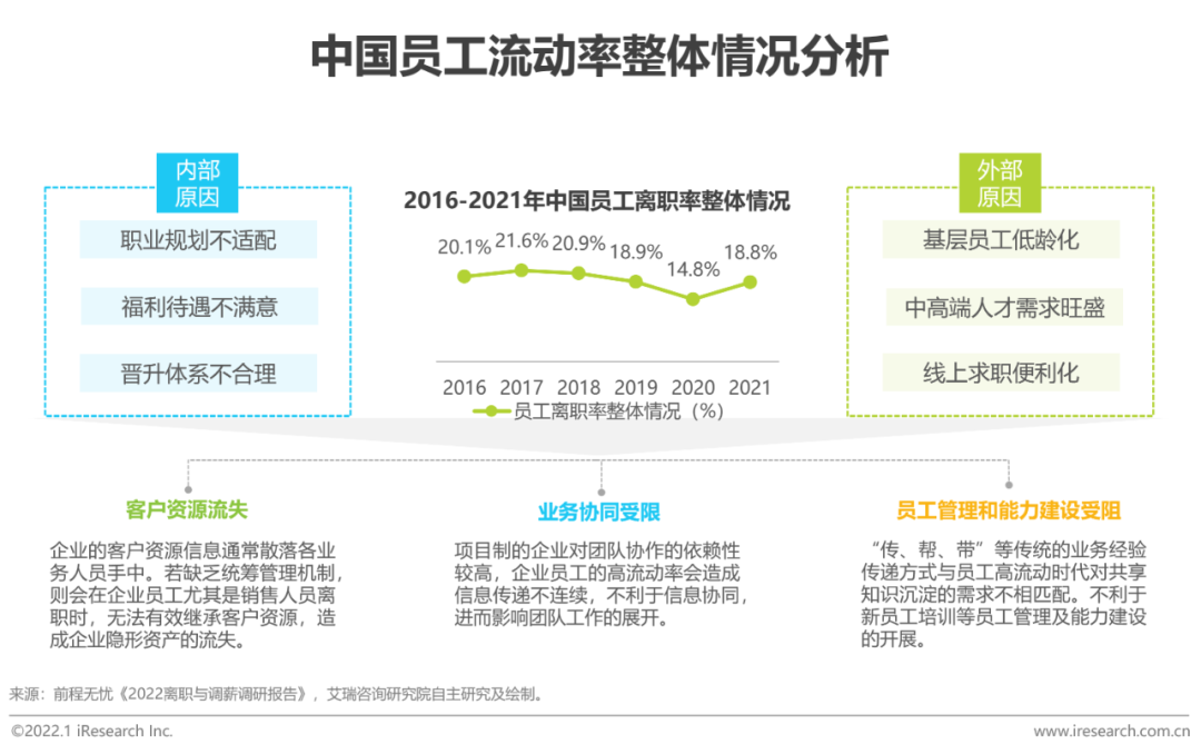 据前程无忧《2022离职与调薪调研报告》显示,2021年员工整体离职率为18.8%,较2020年有4%的回弹(2020年受疫情影响,中国员工整体离职率较低)。员工离职一定程度上造成了企业资源的流失;业务协同遭受限制;同时也会影响业务经验的共享与沉淀,不利于员工管理及能力建设。如何有效存留企业资源,并沉淀为赋能于企业的价值性资产,是当代企业在员工高流动率大环境中亟需破解的难题。