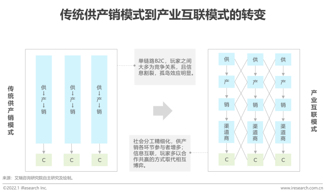 传统模式中,供产销均由一家厂商承担,其产业链呈B2C的单链状态,且各个环节的应用环境相对闭塞,各厂商之间的信息无法互通,形成数据孤岛效应。随着数字化转型不断步入深水区,社会分工不断精细化,企业的合作伙伴越来越多且类型愈发丰富。数字化也从根本上改变了企业合作与竞争的方式,各企服厂商将B2C的传统产业链模式应用于B2B,产业互联网应运而生。在产业互联的生态下,各环节不同规模和角色的参与者之间的信息孤岛被打破,玩家共建生产网络,以合作共赢的方式取代相互博弈,共同为客户提供更好的服务。