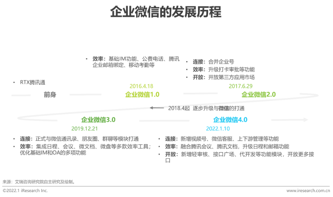 2016年,企业微信1.0上线,主要聚焦于IM场景;2017年,企业微信 2.0上线,合并企业号,API逐渐丰富;2018年,企业微信与微信会话消息、群聊实现互通;2019年,微信第三方外挂软件被封,用户开始大量向企业微信迁移;2020年,以疫情为契机,以私域营销和政企服务为突破口,企业微信开始向更多场景渗透,助力企业数字化升级,生态初步成型;2022年,企业微信在协同办公、客户管理、开发接口等方面进一步升级,上线4.0版本,实现了1000w真实企业数量、1.8亿活跃用户、5亿微信用户连接的体量增长。上线近6年来,企业微信围绕“连接、效率、开放”,不断完善基础功能和平台服务体验,在企业服务市场的价值正在加速释放。