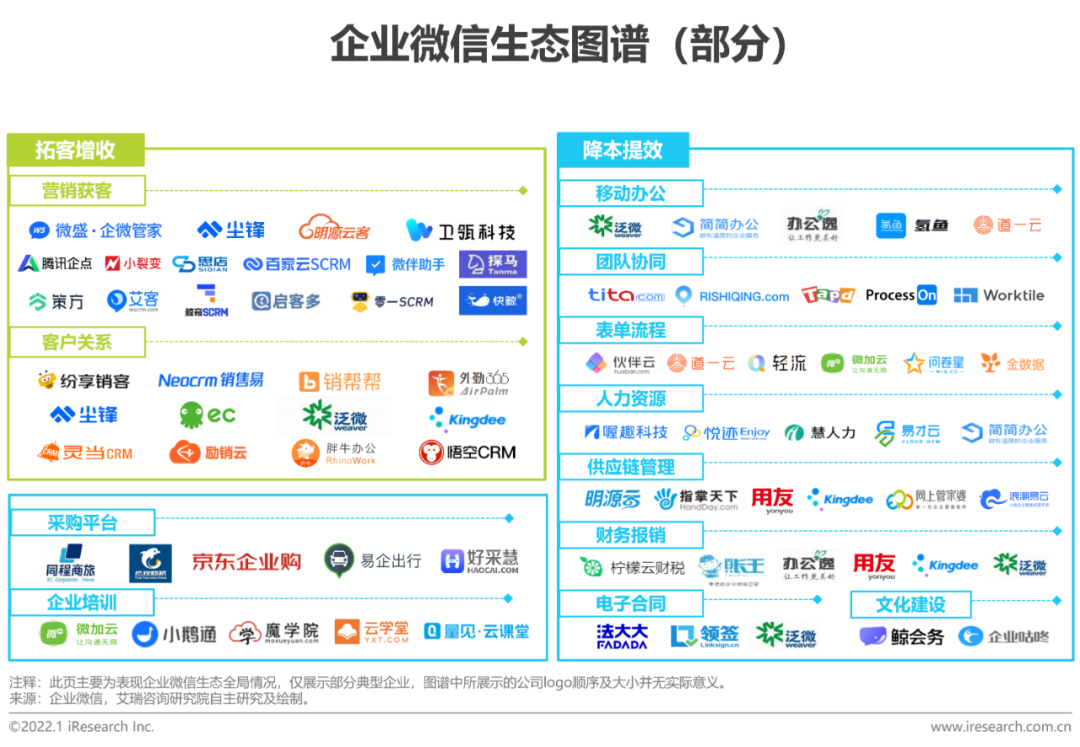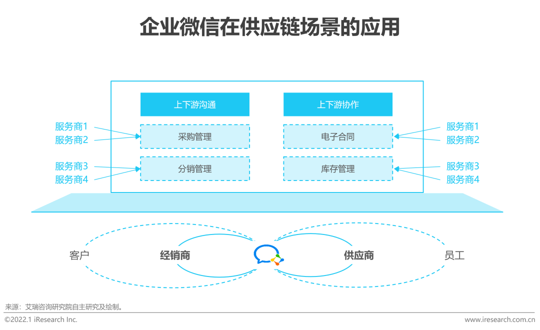 企业微信一方面与工具类协同办公软件类似,可以为企业内部员工提供流畅的数字化办公体验,提升办公效率;另一方面,基于广泛的企微生态,企业微信B2B连接的价值也在逐步释放。在企微平台上,厂商与上下游之间、厂商与厂商之间可以实现跨组织的协同,真正打通供应链端到端的流程,进而实现效率的飞跃式提升。2022年1月10日,企业微信在4.0版本中上线了“上下游”模块,正式开启了B2B场景的探索。未来,预计B2B的供应链管理场景将会与B2C的SCRM场景一同快速发展,为产业互联网带来更多的模式创新和更大的想象空间。