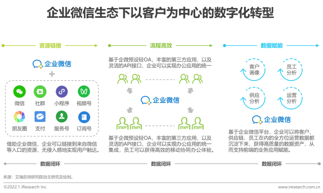 企业微信具有“资源链接、流程高效、数据赋能”的核心价值。向外,企微可以链接微信体系,无侵入感地触达到12亿用户;向内,企微可以实现办公应用的统一集成,让员工获得高效的移动协同办公体验;同时,企微可以沉淀真实数据,形成高质量数据资产,以数据驱动赋能前端业务应用。基于企业微信,企业可以无缝建立端到端的数据闭环,顺畅地实现以客户为中心的数字化转型。