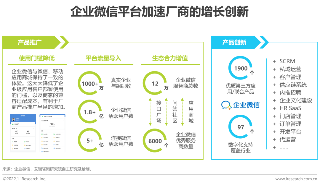 企业微信作为连接消费互联网和产业互联网的数字化平台,具有客户触达、流量导入、生态聚合及场景创新的价值,可以帮助厂商更好地进行产品推广和创新迭代。①产品推广:企业微信与微信互联互通,并沿袭了微信C端产品的体验,在导入流量、聚合生态的同时,降低了企业部署、员工使用和厂商兼容适配的门槛,可以帮助厂商更好地进行推广;②产品创新:企业微信以连接的力量打破了产业流程中的许多边界,形成了更大的生态聚合,并促生了更多的高价值场景。新场景为初创厂商和传统厂商都带来了更多的创新点和机会点。