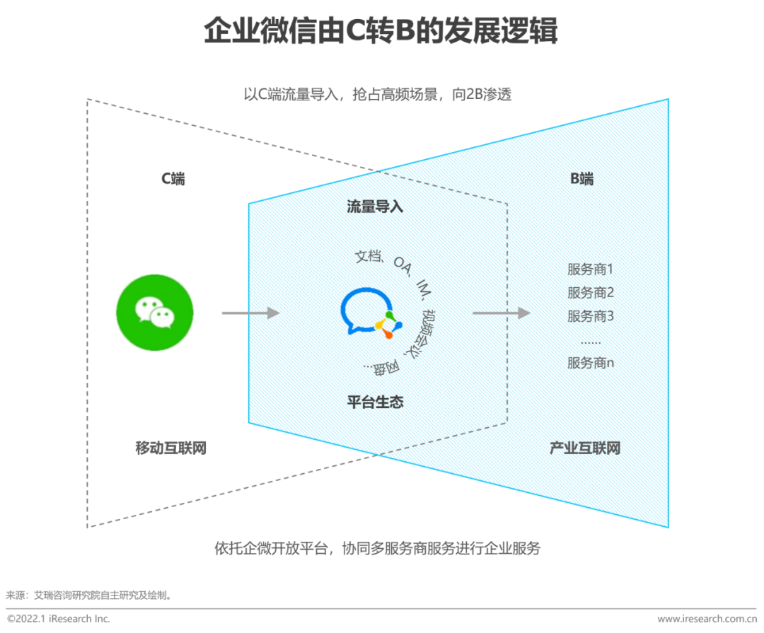 整体来看,企业微信在产业互联网中扮演着流转枢纽的角色,以平台的方式连接B2C(企业微信-微信-消费者、企业微信-员工)和B2B(企业-经销商-企业微信-服务商-供应商、服务商-企业微信-服务商……)多元场景。基于其强大的连接能力,企业微信积累了广泛的生态体系。进而,依托企微平台,生态内各厂商可以形成合力,为企业提供一站式的数字化转型解决方案,加速企业数字化转型。