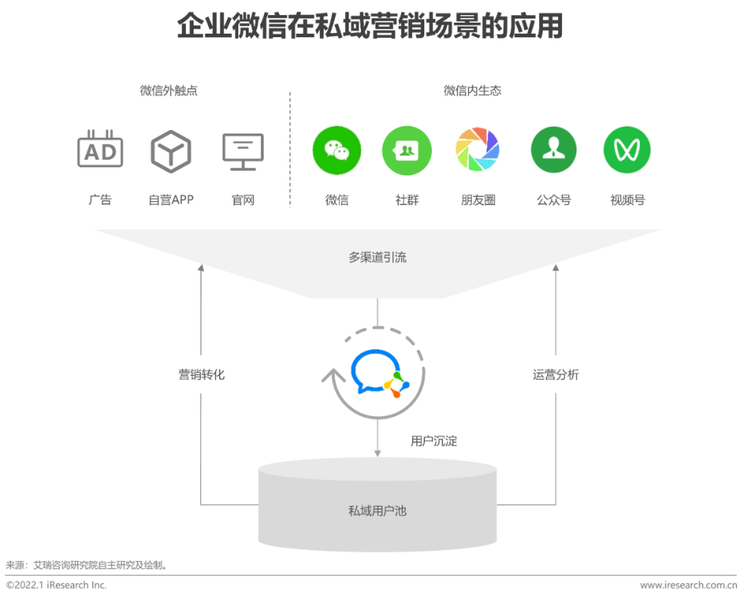 在公域平台获客成本高企的背景下,私域渠道加速增长。继公众号、小程序后,腾讯推出了私域的又一新载体——企业微信。企微具备「前端流量链接+后端客户运营」的双向价值,是私域营销的最佳载体。向前,企微可以与微信打通,触达微信12.6亿用户,以无侵入感的方式与客户建立紧密联系;向后,企微可以将来自多渠道的用户收拢,形成私域用户池,再利用数字化手段,赋能客户价值提升。基于企业微信,企业可以创新更多社交裂变私域玩法,提升服务质量,改善客户体验,建立以客户为中心的运营体系,实现商业增长。