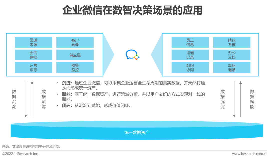 从数智决策的实现过程来看,影响企业向数据驱动转型的卡点往往存在于链条的两端:一前——跨部门、跨系统数据难以打通,一线真实数据难以获得,导致数据资产建设难、质量差;一后——员工使用不方便,特别在实时性方面体验差,导致对一线业务赋能价值的折损。以企业微信为中枢,企业一方面可以无缝地将真实运营数据沉淀下来,另一方面可以直接在员工工作界面(对话框等)进行赋能,“沉淀⇄赋能”双向互动,天然形成了数据和价值的闭环。