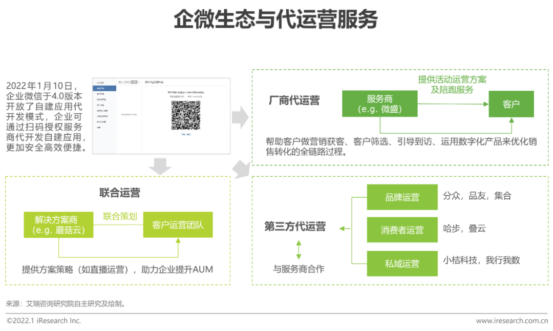 从需求端来看,现阶段中小微企业对于数字化转型的思考和执行能力还并未成熟,且企业微信玩法还较为新颖,需要外部厂商在咨询、开发、运营的一些具体问题上给予其助力。从供给端来看,企业微信平台上的生态合作伙伴主要由SaaS厂商和初创厂商构成,受限于商业模式和内部运营机制,往往难以满足客户陪跑的诉求。供需的不匹配催生了基于企微开发商和企业之间新的代开发、代运营市场。