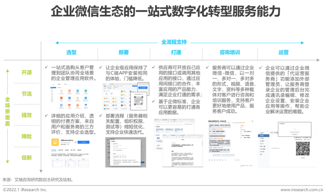 企业微信平台聚合了多种类型的软件开发商,其第三方应用市场覆盖支持企业数字化转型多元场景的APP,包括SCRM、CRM、OA、财务管理、HRSaaS、采购、电子签、企业培训软件等,可以满足企业开源、节流、提效、降险和促新的多种诉求。对于数字化能力缺失的中小微企业而言,企业微信平台可以提供一站式的最佳实践。同时,基于企业微信特有的连接和开放能力,企业还可以获得从选型,到部署、打通,到咨询培训、运营的全流程支持。