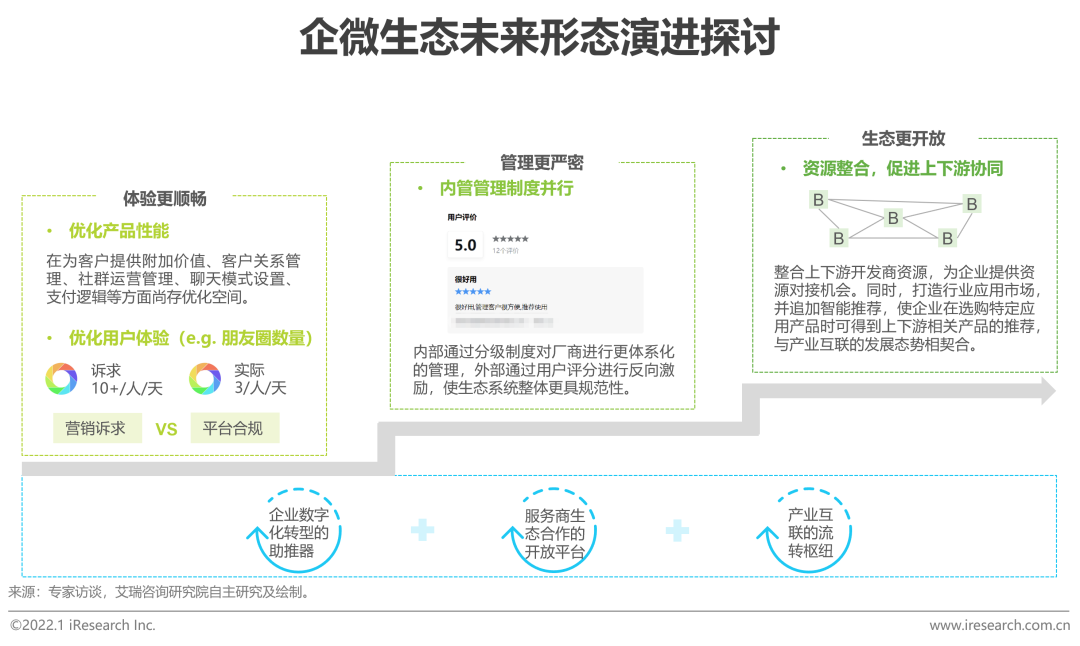 企业微信为各供应商搭建了开放的生态平台,在部分数字化场景实践中颇具成效,但其在产品体验、管理模式及生态建设方面仍具有价值释放的较多可能。首先,为提升用户体验,企微也在逐渐布局更完备的产品体系,优化产品内在性能,在客户诉求和合规性中寻求最佳平衡点。其次,企微内部对各厂商的分级制度化管理与外部用户反馈结合,可使供应商在生态平台内得到更具标准化及透明化的管理。最后,产业互联为企业微信在B2B场景及上下游资源整合的探索增添更多可能性。基于不变的产品定位,企业微信将积极挖掘更多场景,拥抱各类型厂商共建生态,共同为行业的数字化发展赋能。