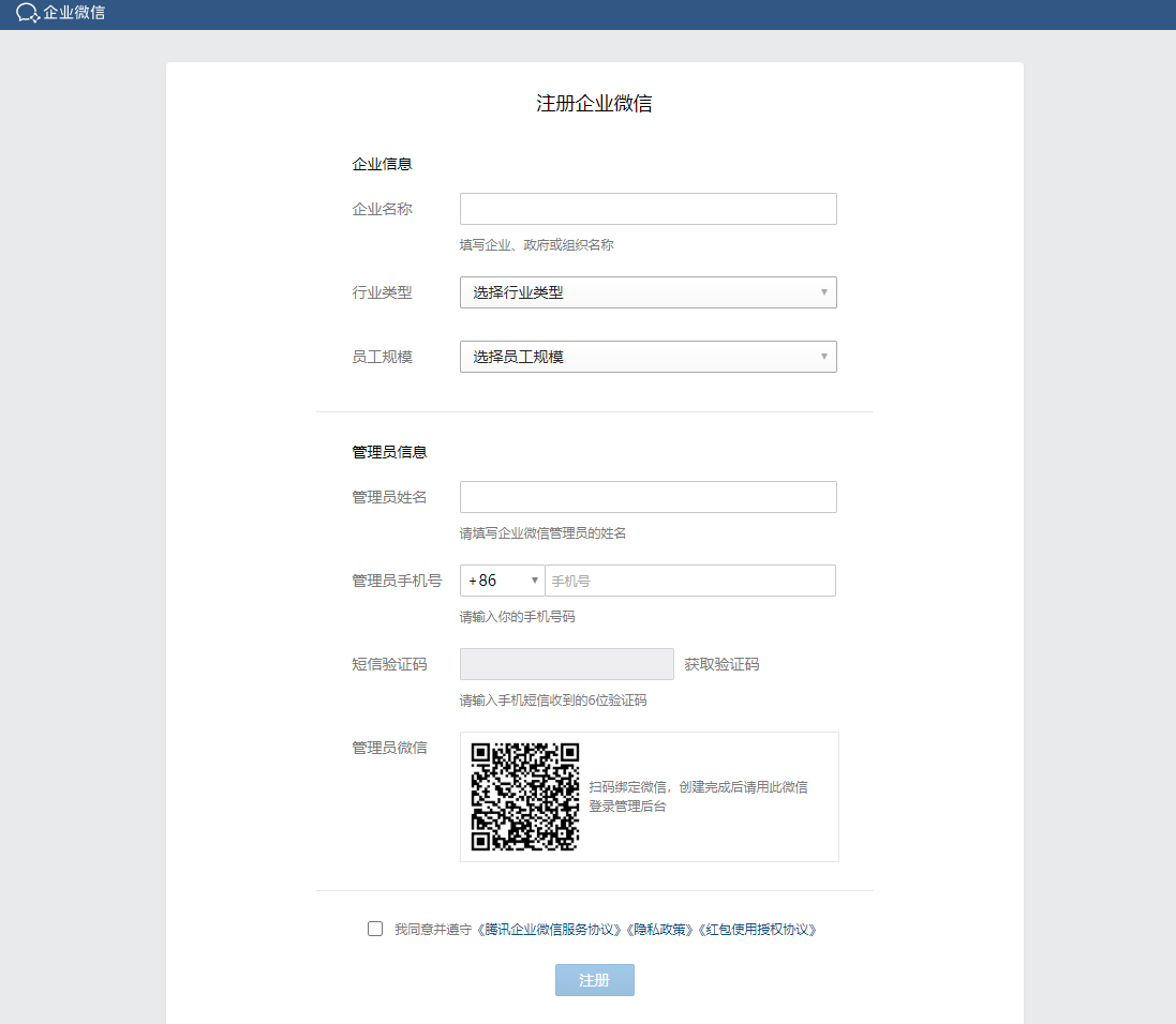 注册时,需要填写企业信息(企业名称、行业类型、员工规模)、管理员信息(姓名、手机号、短信验证码、管理员绑定了实名银卡的微信进行扫码)、同意并遵守《腾讯企业微信服务协议》《隐私政策》《红包使用授权协议》协议。