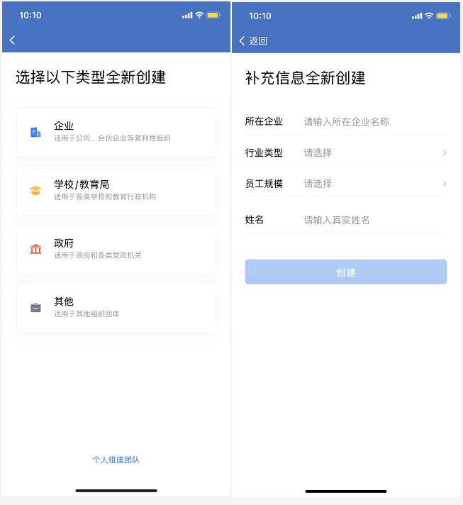 注册时需要选择企业类型、补充企业信息(企业名称、行业类型、员工规模、创建人姓名)