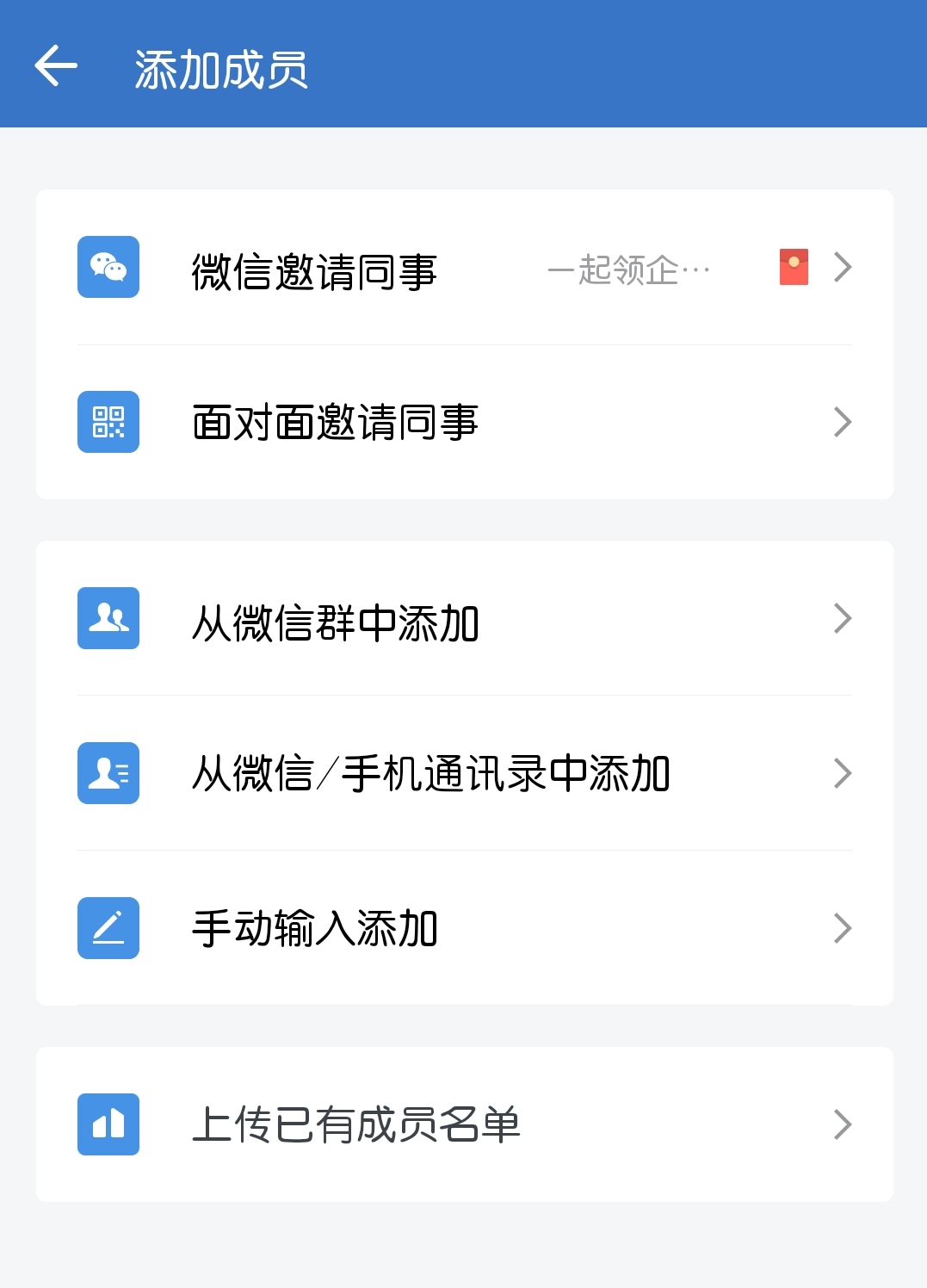 注册完成后,创建人可以直接进入企业微信APP,在【通讯录】-【添加成员】中邀请同事加入。加入的方式有多种:微信发送链接、发送二维码邀请同事扫码、直接从通讯录添加、批量上传同事信息并邀请等,我们可以根据实际情况选择合适的方式。