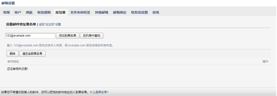 作用:将一个邮件地址或者域名添加到黑名单,就不会再收到该地址或该域名下各个邮箱发来的信件,有效防止垃圾广告邮件。