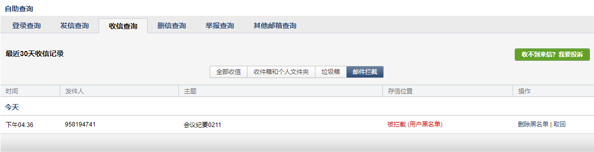 黑名单中的发件人的来信会直接被拦截(自助查询-收信查询),如需要接收该邮件也可以删除黑名单并取回邮件。