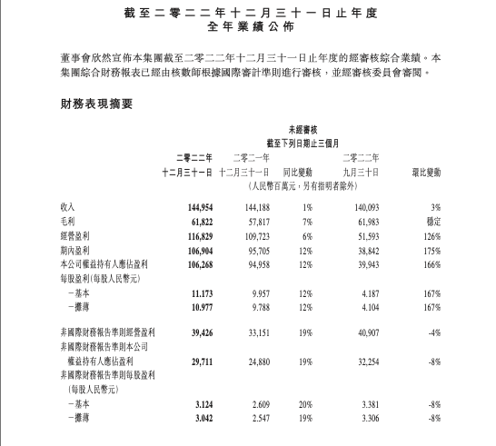 腾讯控股(00700.HK)今日发布2022年第四季度及全年财报。财报显示,腾讯第四季度营收1449.5亿元,同比增长1%;净利润(Non-IFRS)297.11亿元,同比增长19%。是自2021年三季度以来,首度恢复两位数增长。