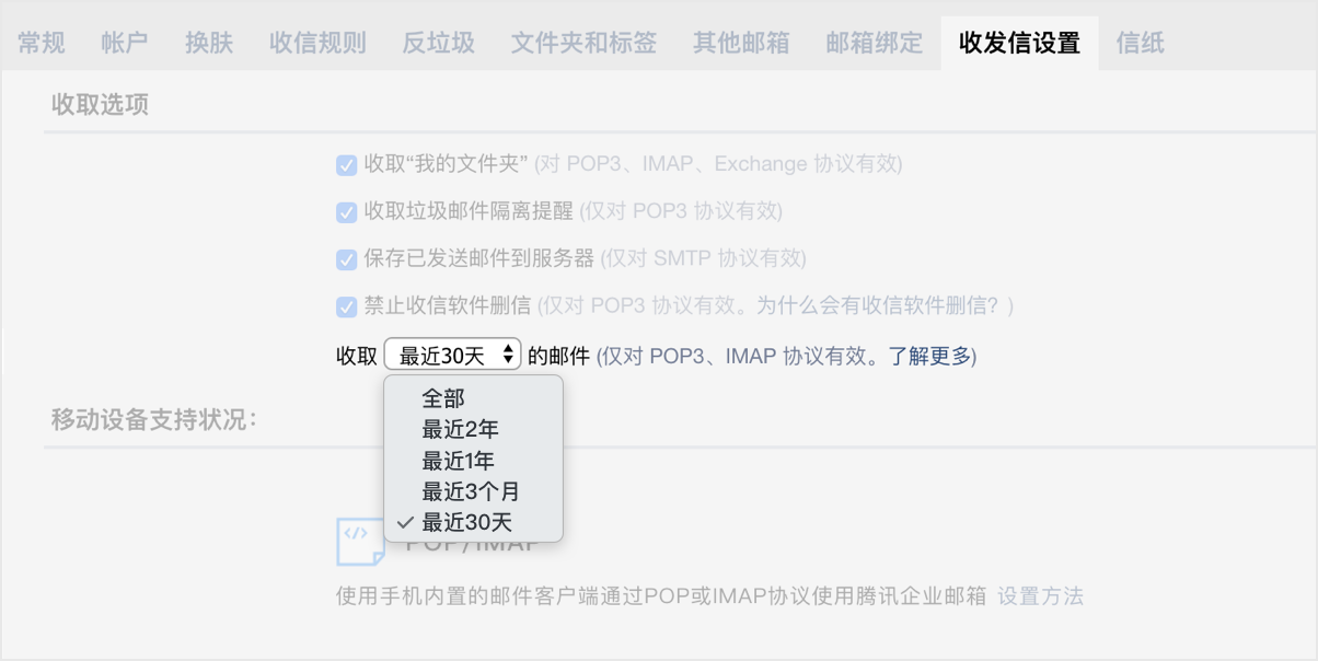 · 客户端可收取邮件的范围现已支持收取 最近30天、3个月、1年、2年、全部 的邮件。