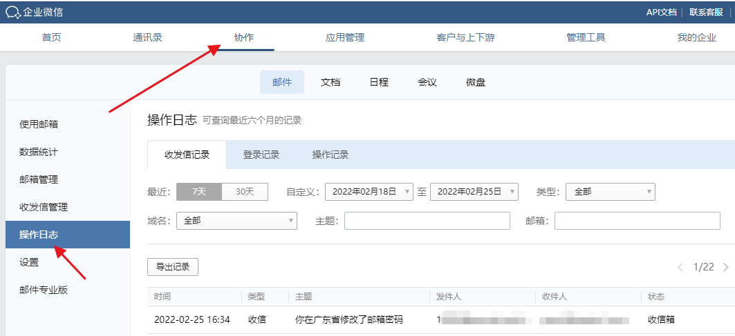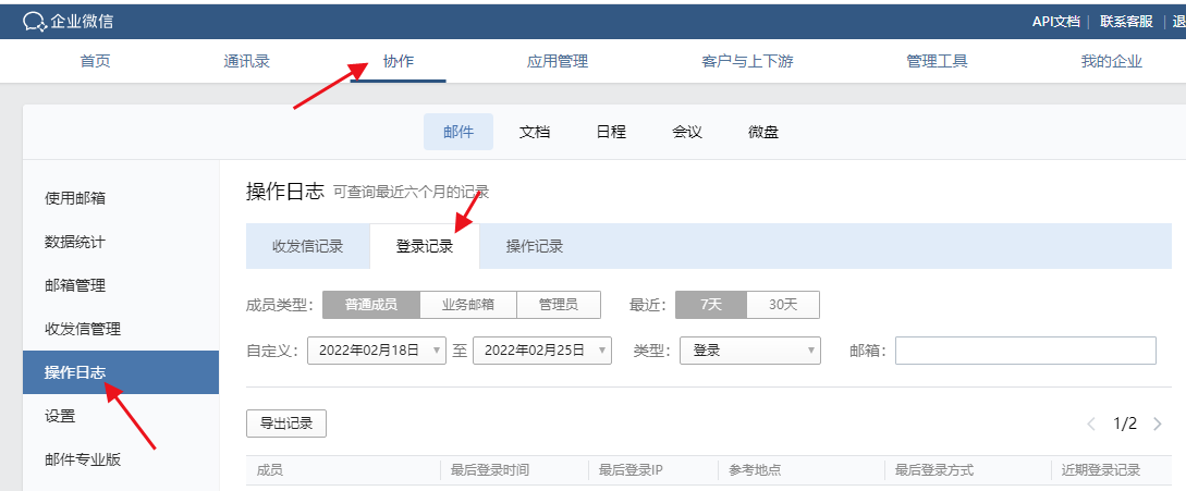 1.登录企业微信管理后台—协作—操作日志—收发信记录,支持通过选择时间、成员邮箱账号和类型(全部/发信/收信)组合查询邮件记录以及投递状态。2.登录企业微信管理后台—协作—操作日志—登录记录,专业版可以查询和导出近6个月所有成员和管理员以及业务邮箱登录记录,基础版可以查询和导出近3个月所有成员和管理员以及业务邮箱登录记录。