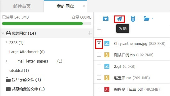 1、登录邮箱,点击左下角的“网盘”按钮,选中要发送的附件,点击上方的“发送”按扭,输入收件人地址、邮件主题、正文后点击发送邮件。