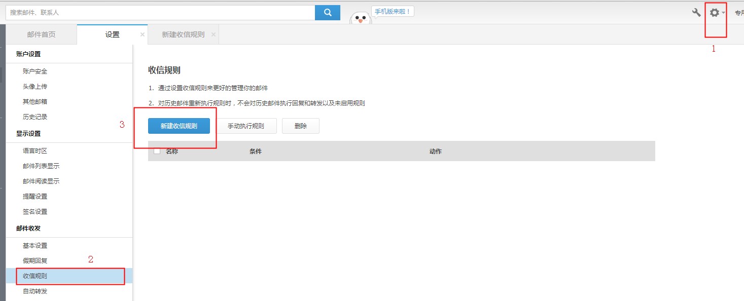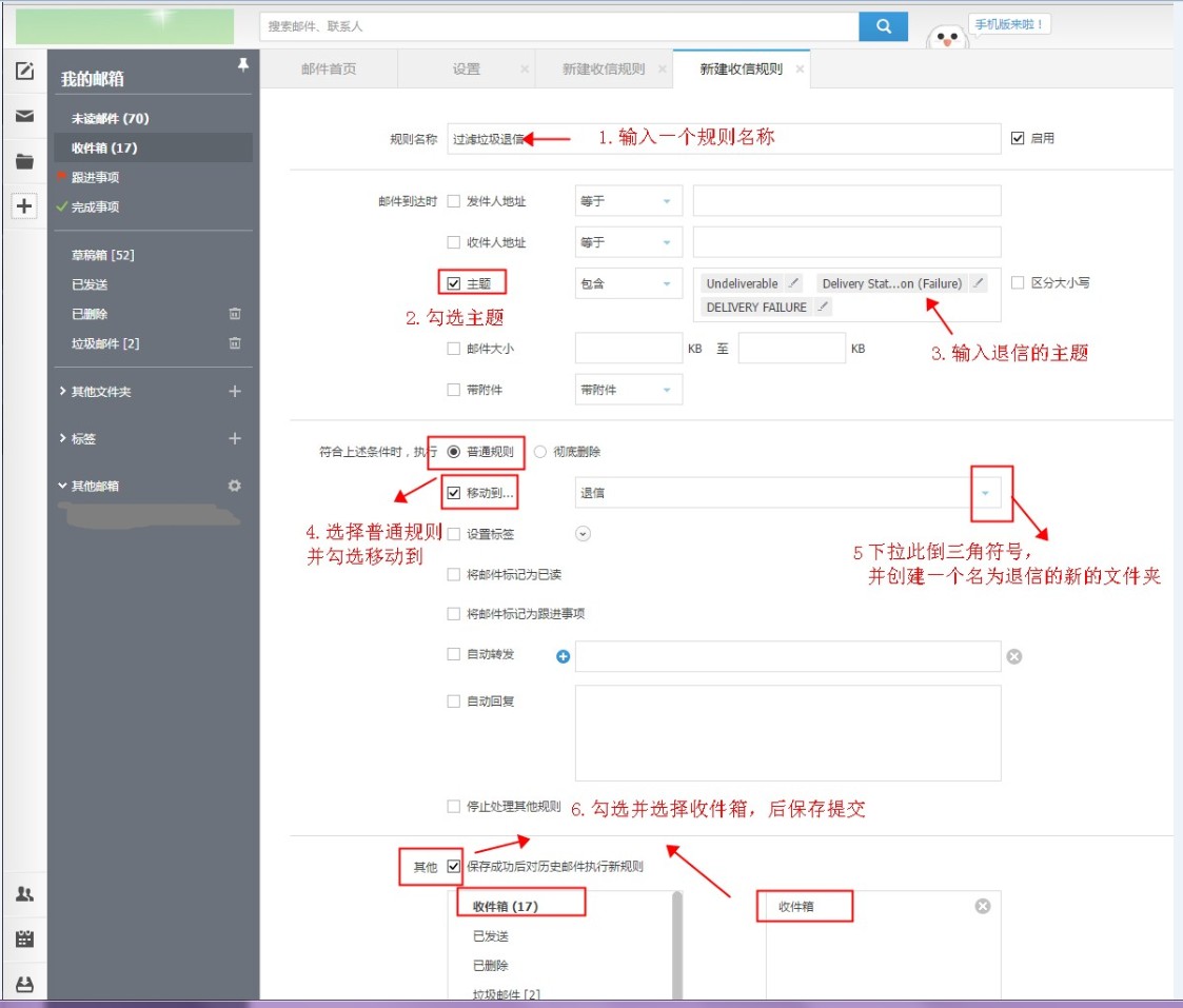 针对收取到的退信邮件,用户可以参考下图设置来信规则,将对应退信的主题作为关键字,指定移动到某一个文件夹里,后对收件箱中的历史邮件执行此规则,选择收件箱,将之前的退信移动至此文件夹中,使得收件箱不被退信淹没。