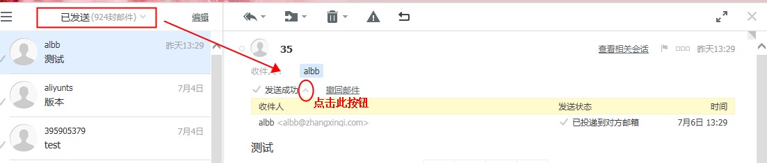判断企业邮箱邮件已由我们服务器发送成功与否的标志, 发送状态 显示为 已投递到对方邮箱 或 已投递到对方服务器 ,如下图所示: