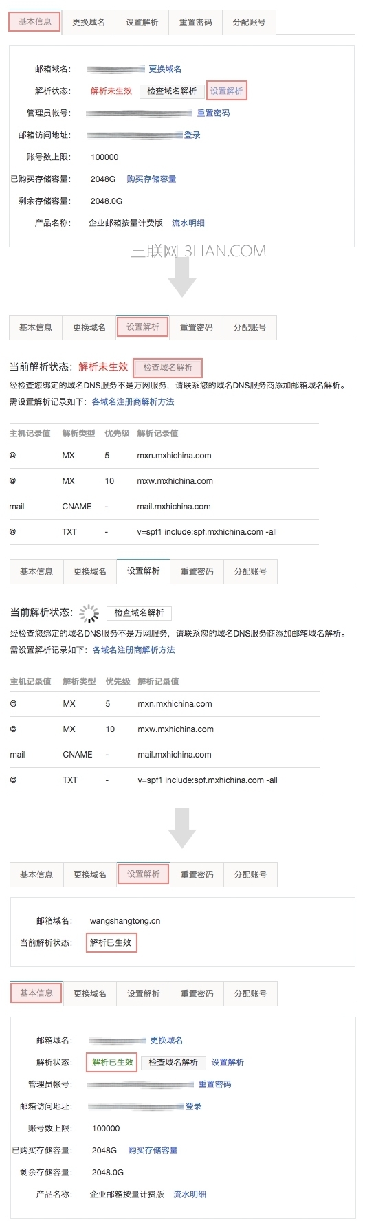如果您购买的域名和您购买的企业邮箱在统一会员ID下,但域名MX自动解析未生效,可以在“设置解析”标签页下点击“检查域名解析”按钮,系统会自动对您域名解析的状态进行检查和更新,具体流程如下:
