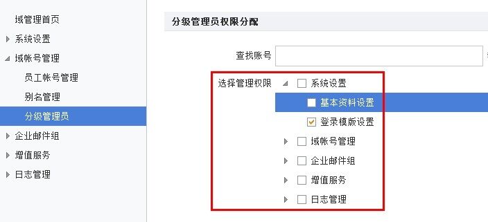 以及其它开通权限的类目管理权限(系统设置,企业邮箱组,增值服务,日志管理)分级管理如何设置?分级管理员权限?